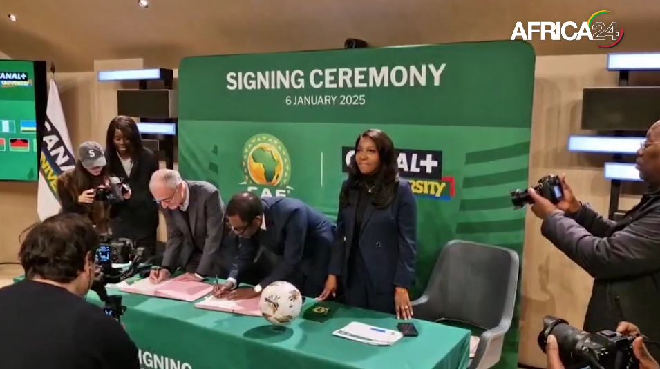 Jacques du Puy président de Canal Plus international et Veron Monsengo-Omba secrétaire général de la Caf ont signé un nouveau...